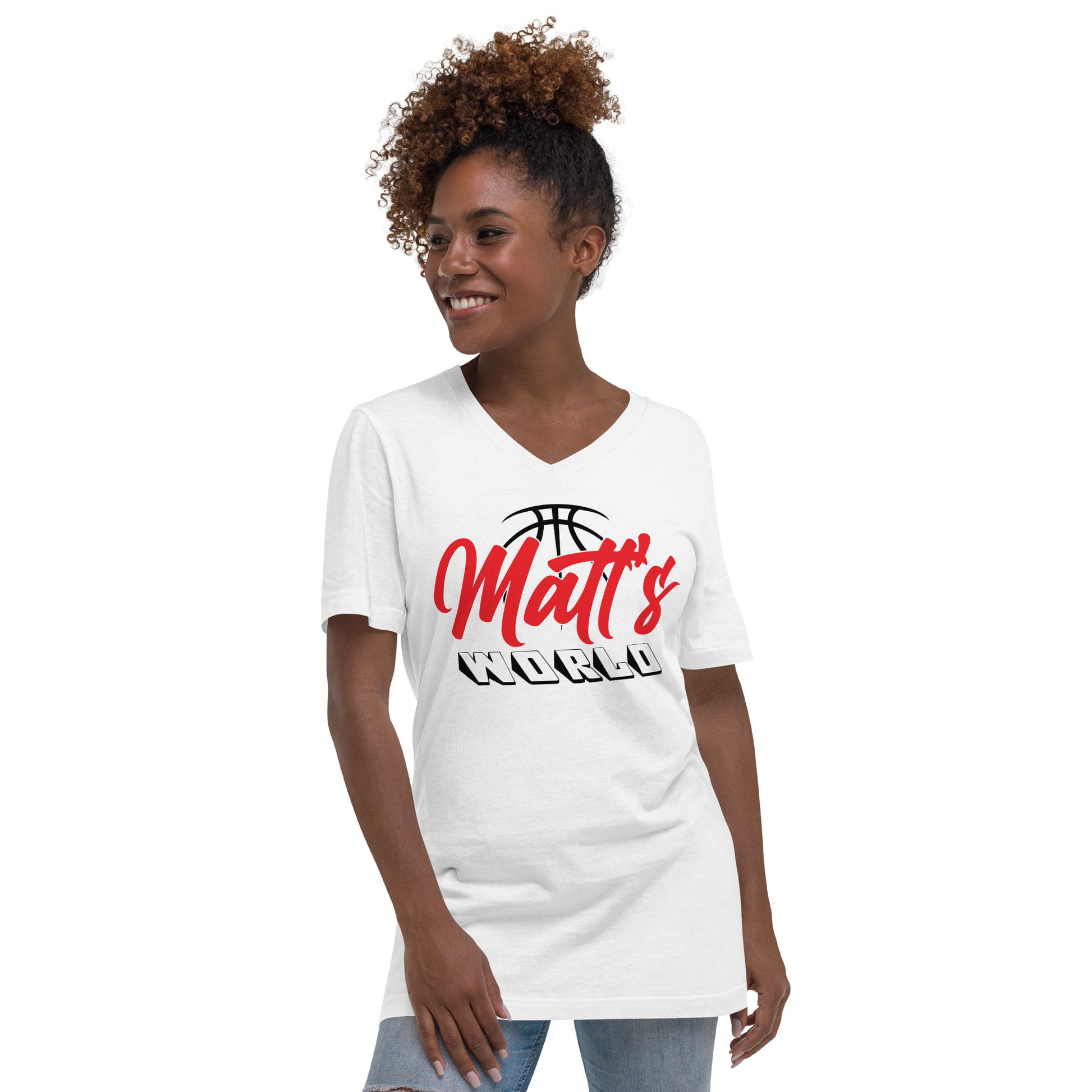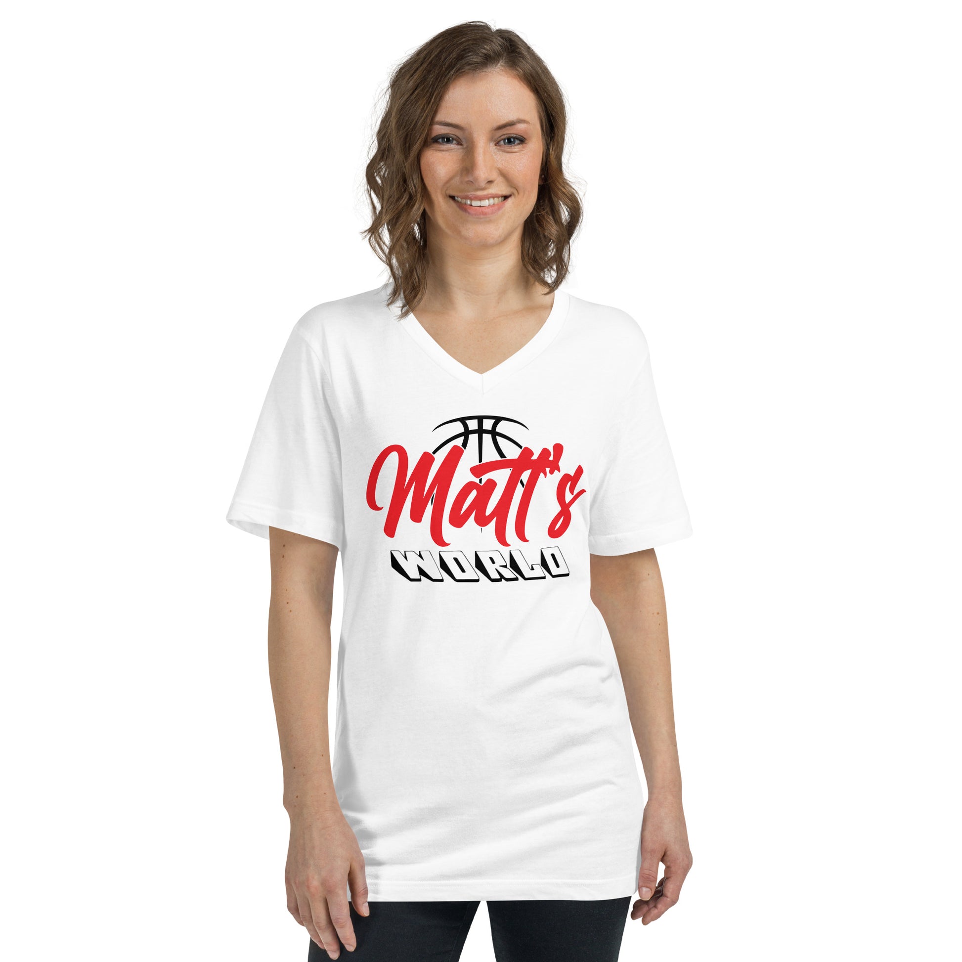 Matt's World w/ MKCF on Back - White Unisex Short Sleeve V-Neck T-Shirt