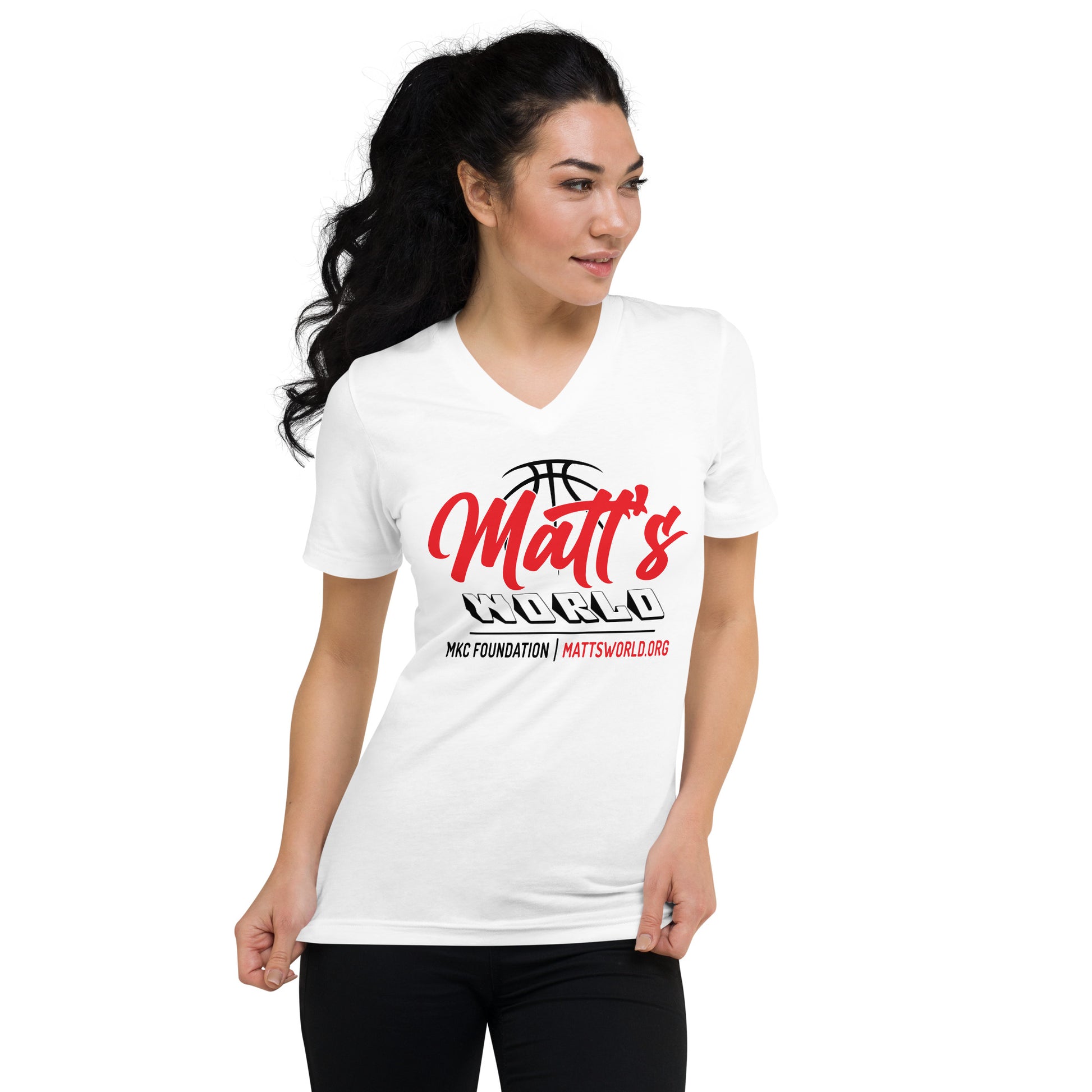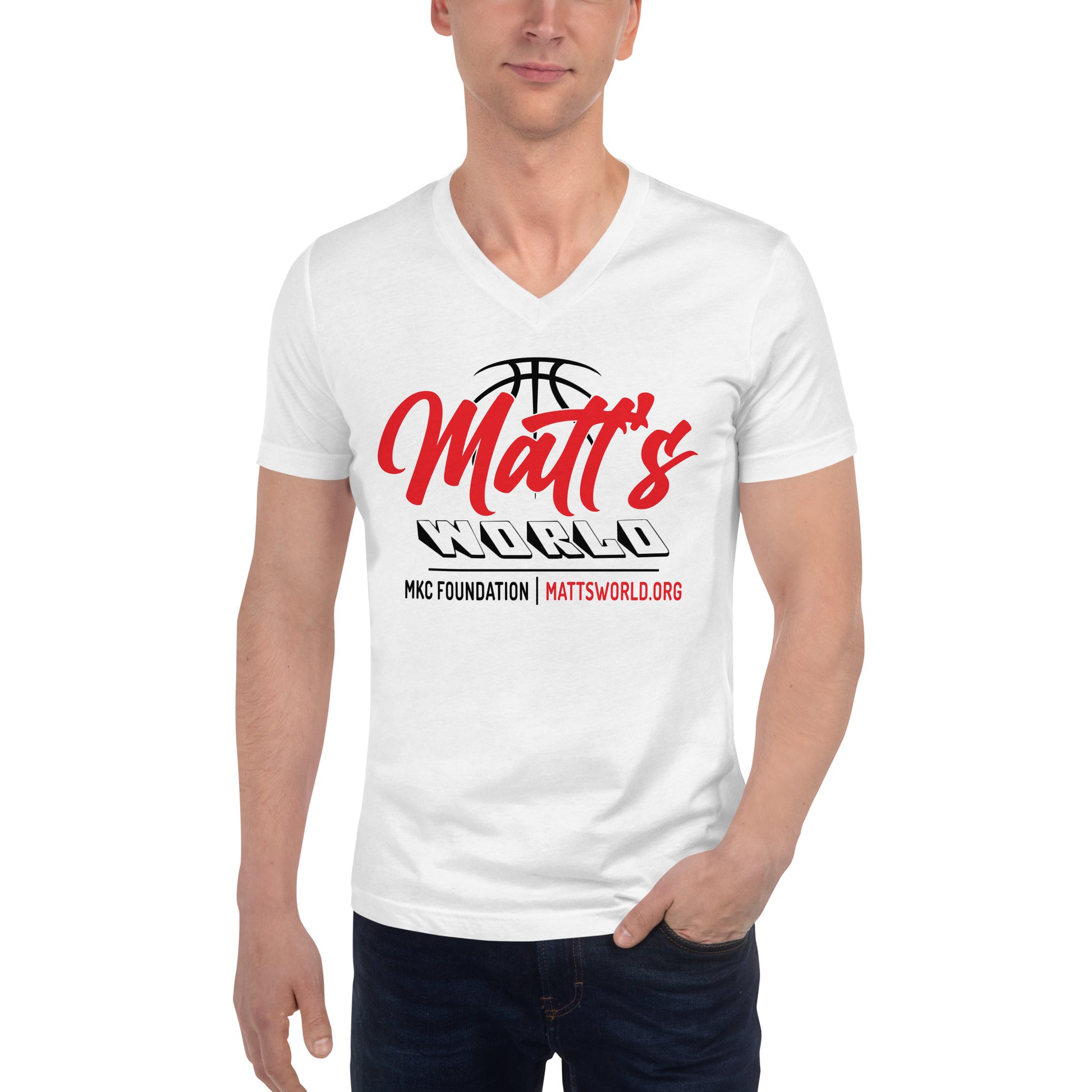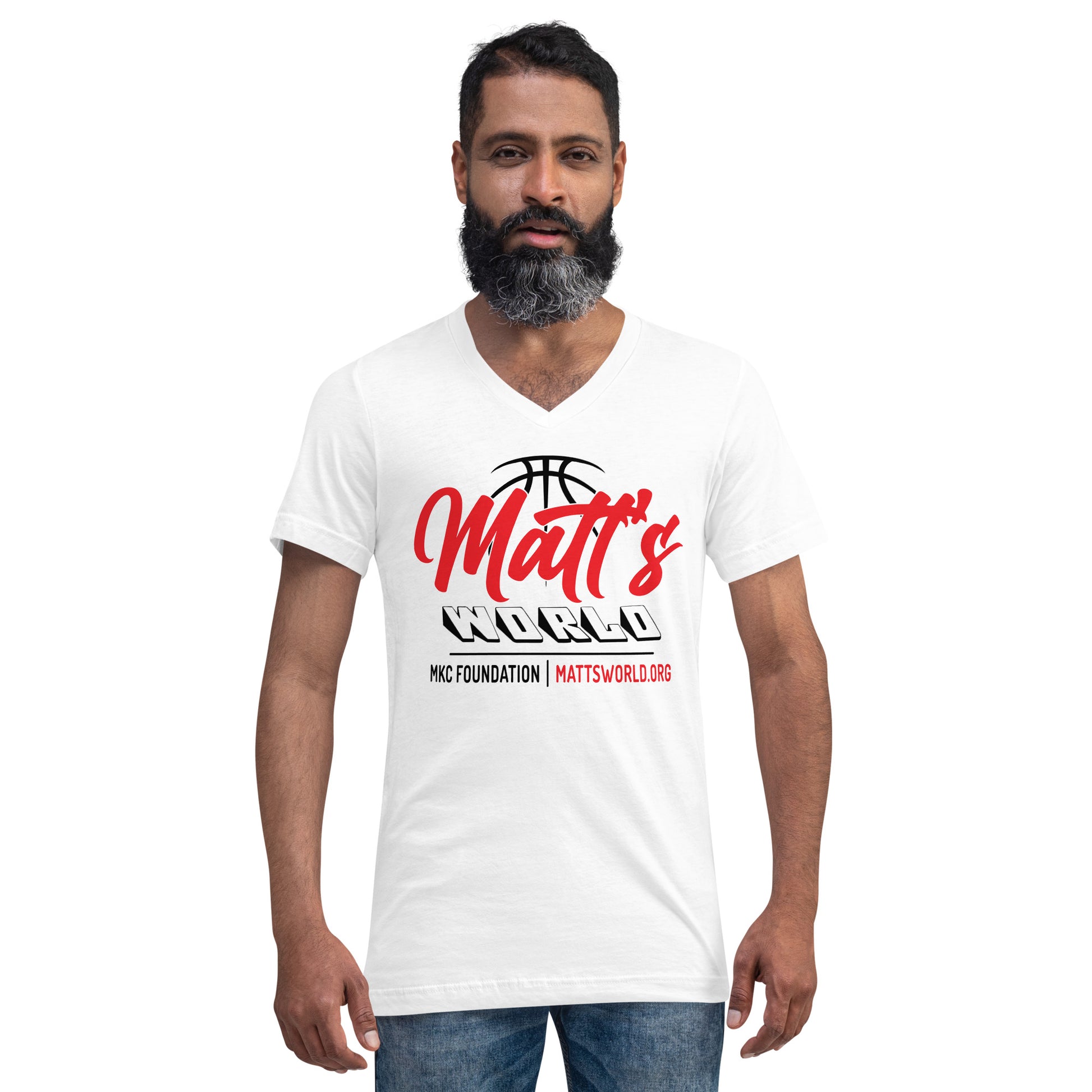 Matt's World in White - Unisex Short Sleeve V-Neck T-Shirt